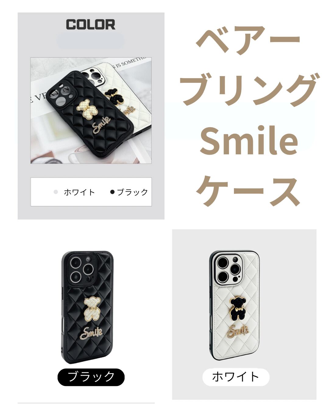 【iPhone16対応】ベアーブリングSmileケース(ブラック/ホワイト)
