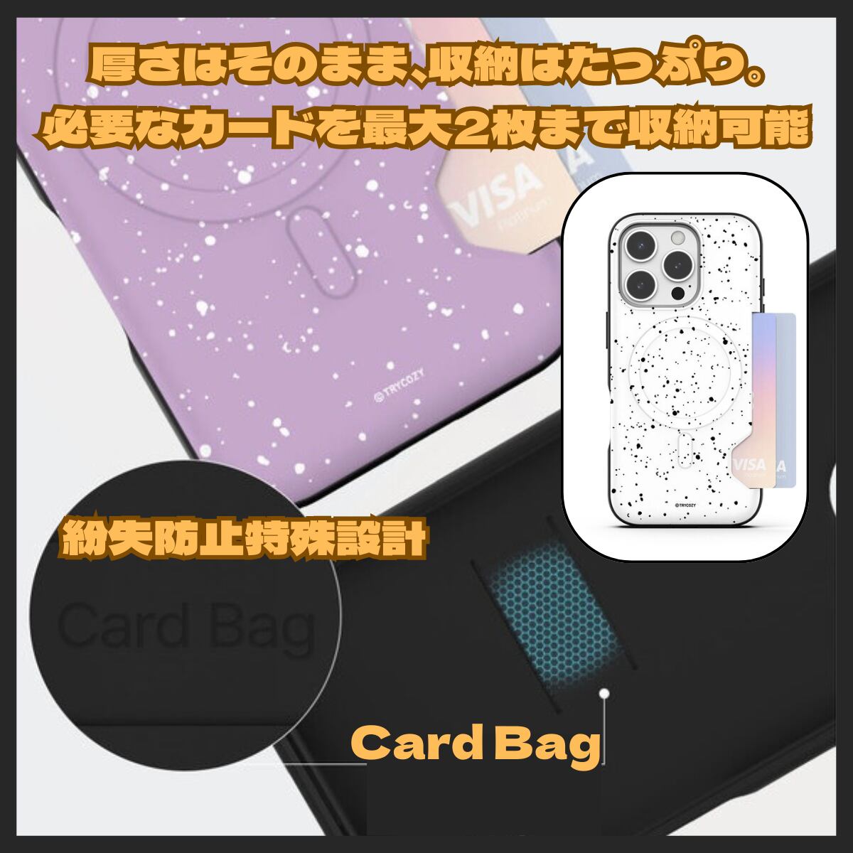 ◎2カード収納設計:VISAなどのカードをスマートに収納。紛失防止の特殊構造で安心。