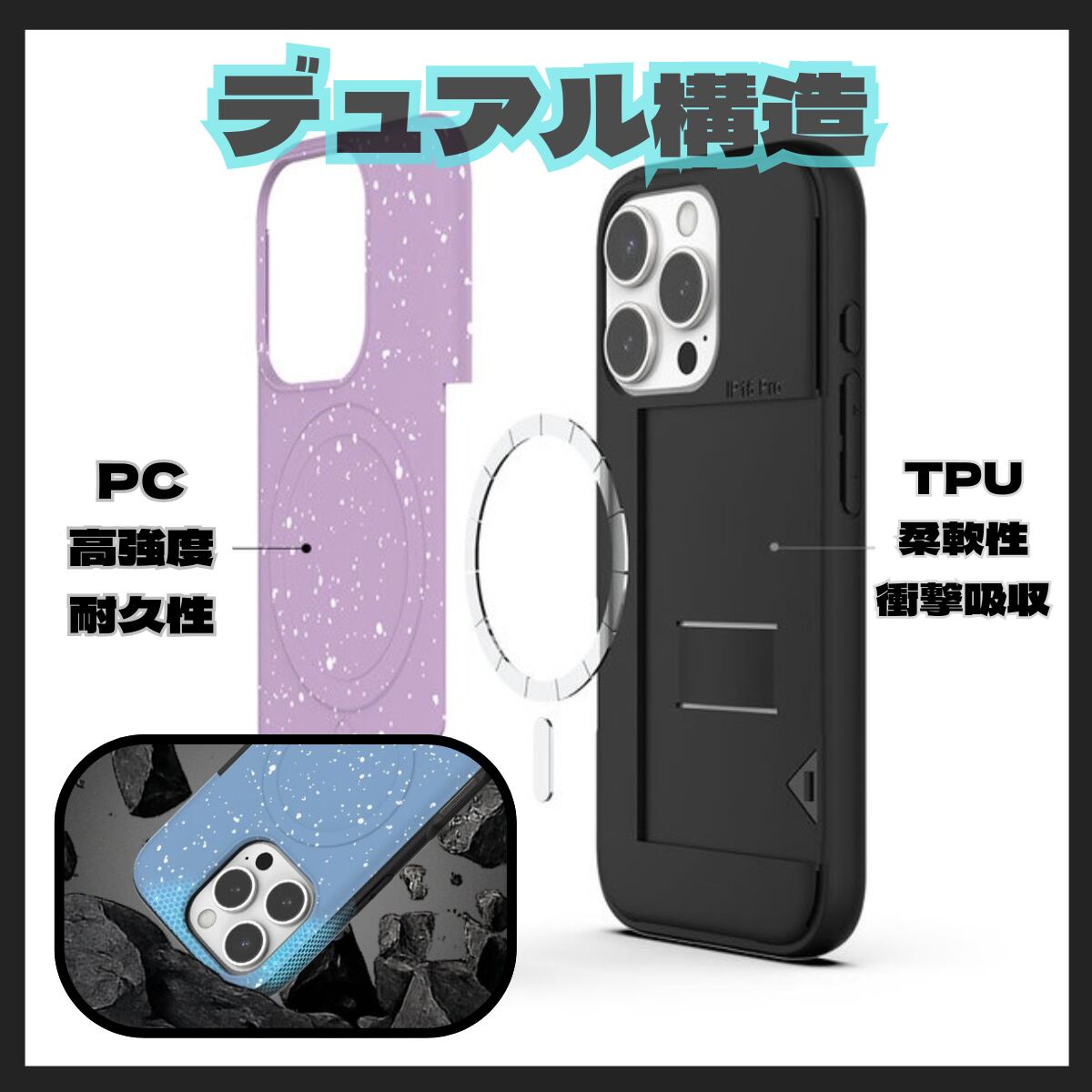 ◎ 高級感あるマット素材:手触りの良いマット仕上げで指紋が付きにくく、高級感をプラス。 ◎ デュアル構造でしっかり保護:PC(高強度素材)+TPU(柔軟で衝撃吸収)を組み合わせた耐久設計。
