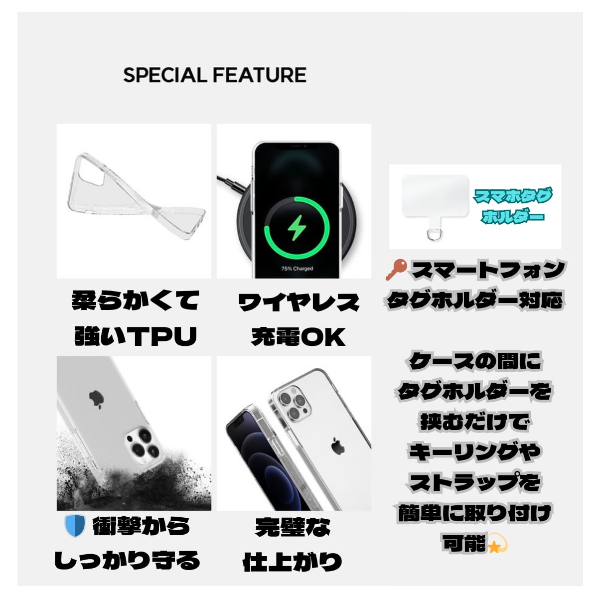 柔らかくて強いTPU素材でしっかり保護・衝撃吸収でスマホを守る安心設計・ワイヤレス充電OK!・ストラップホルダー・タグホルダー対応