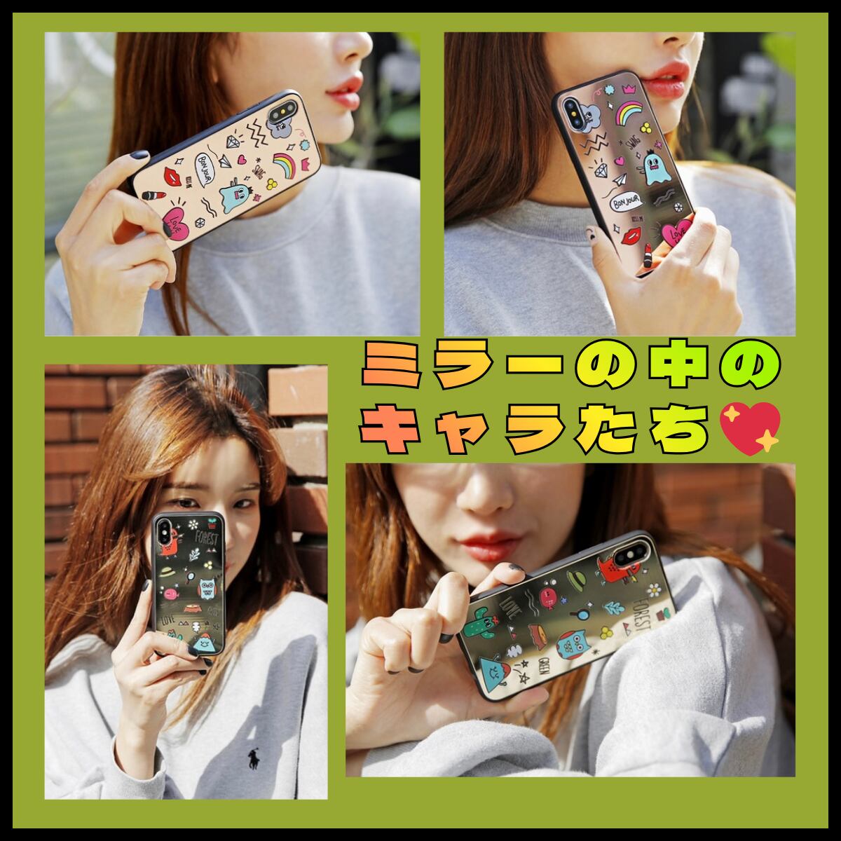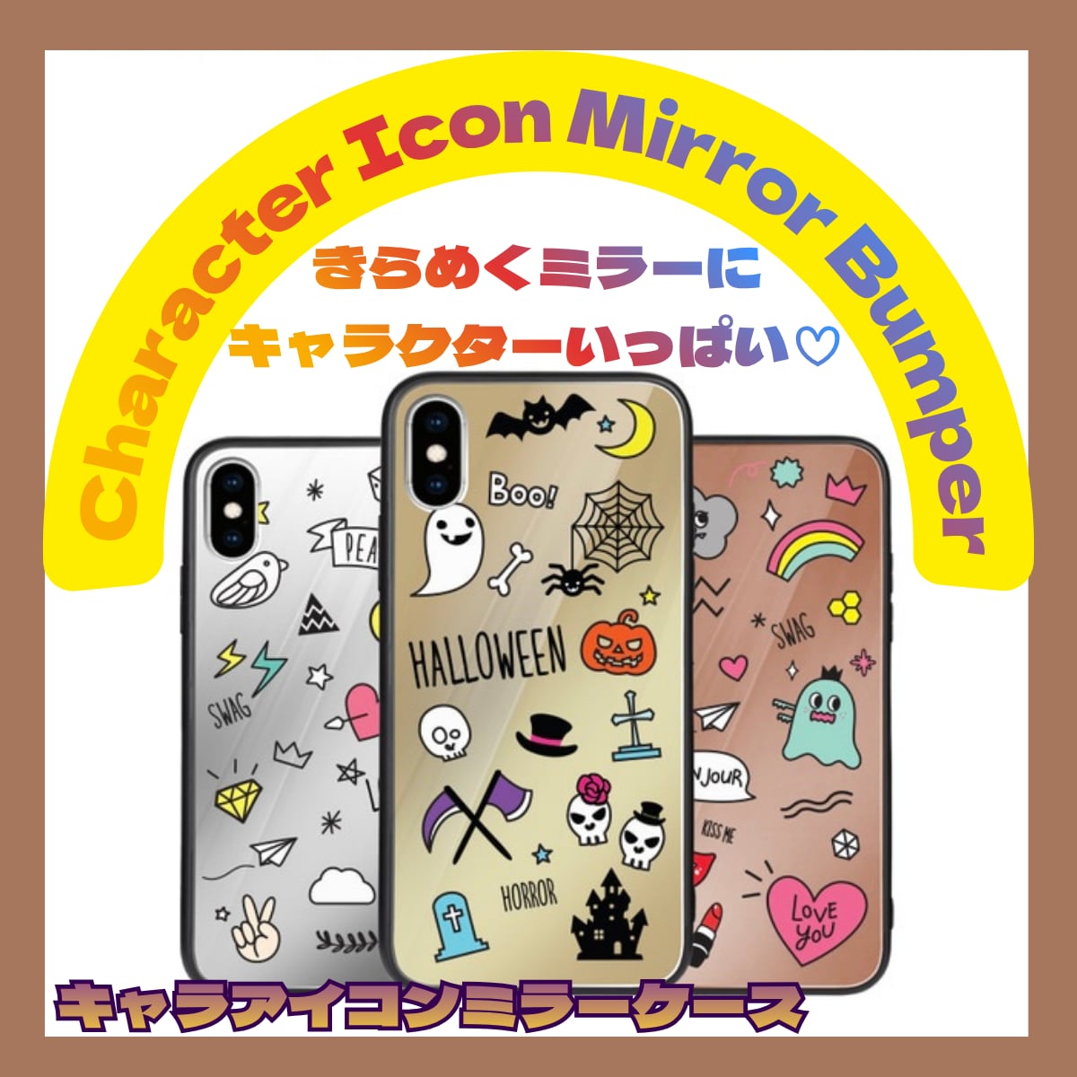 ✨デザインとカラー キャラクターアイコンがかわいいミラー付きバンパーケース。
